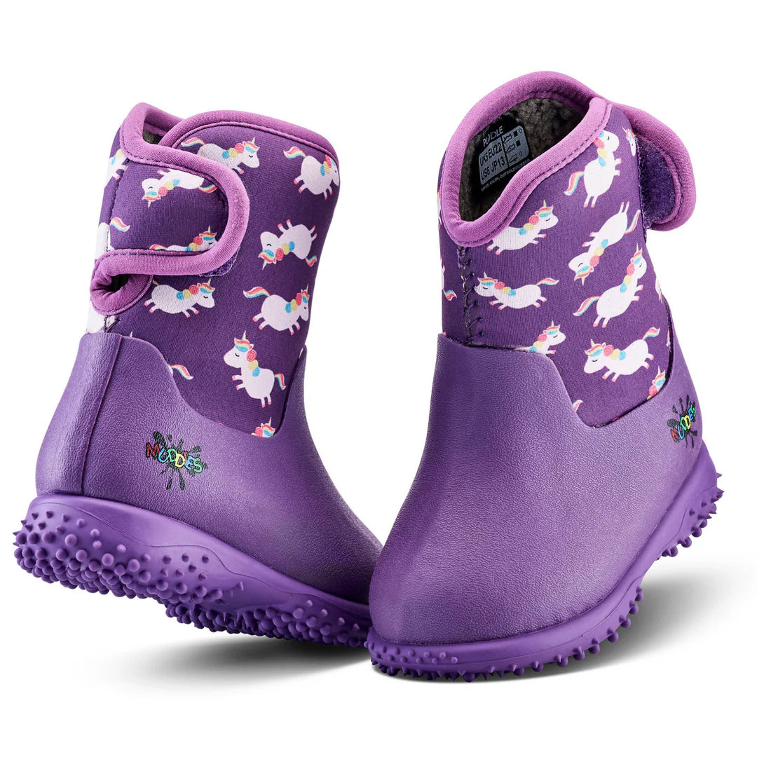Stay warm, dry, and stylish all year round with the Muddies Waterproof Boots in Unicorn or Dino print from Grubs Boots. These fleece-lined barefoot winter boots have a temperature rating of -20°C and can handle all kinds of weather, from freezing cold to mild heat.