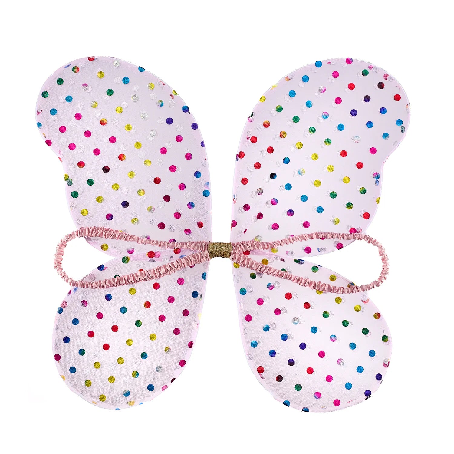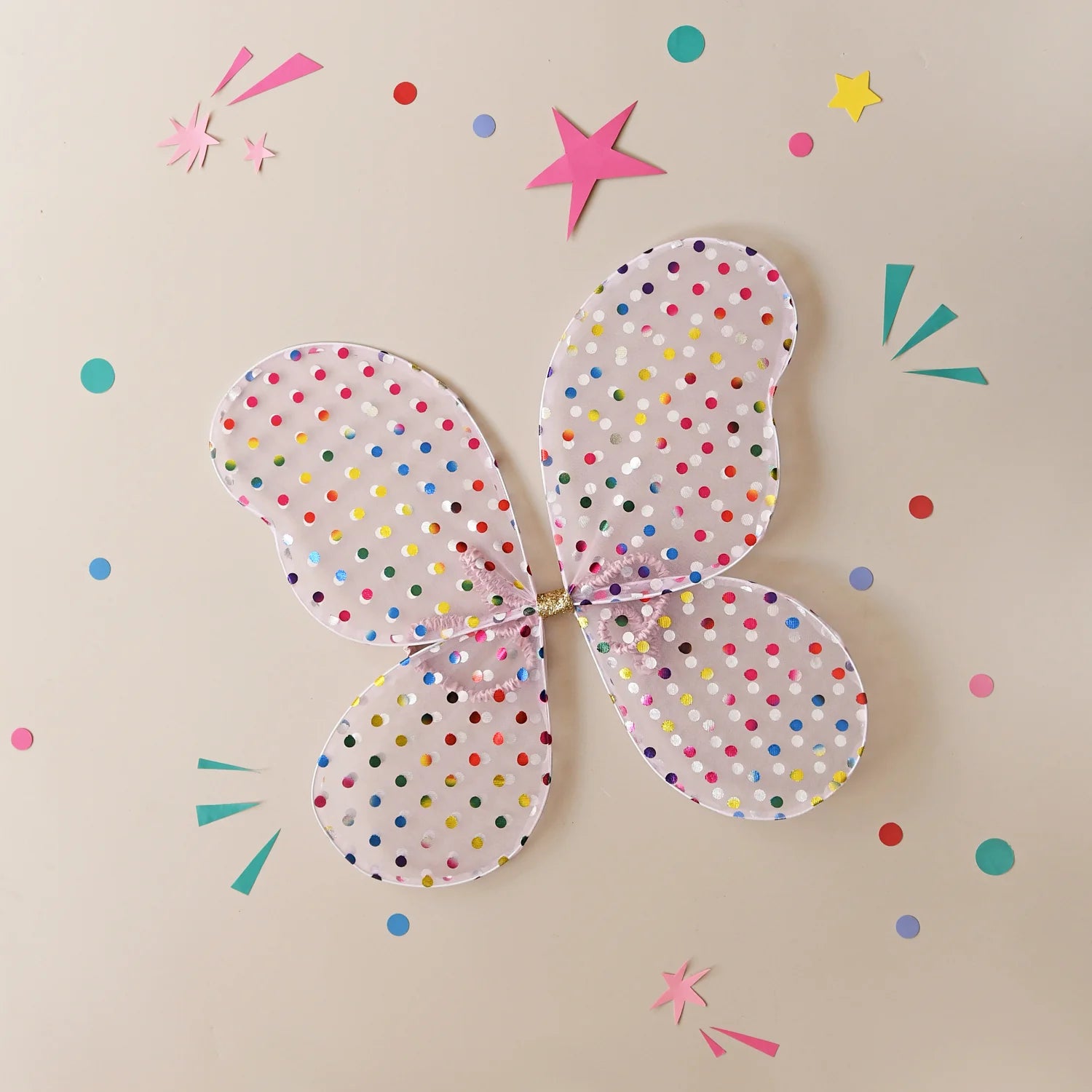 Sprinkle some fairy dust and watch their imaginations take flight! Made from soft tulle and adorned rainbow foil spots, each set of wings has satin covered elastic straps making them comfy and easy to wear. The perfect accessory for little dreamers and rainbow chasers!