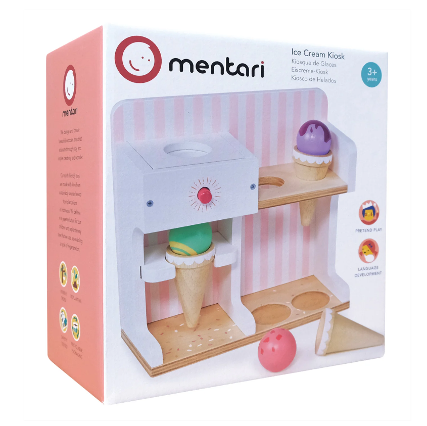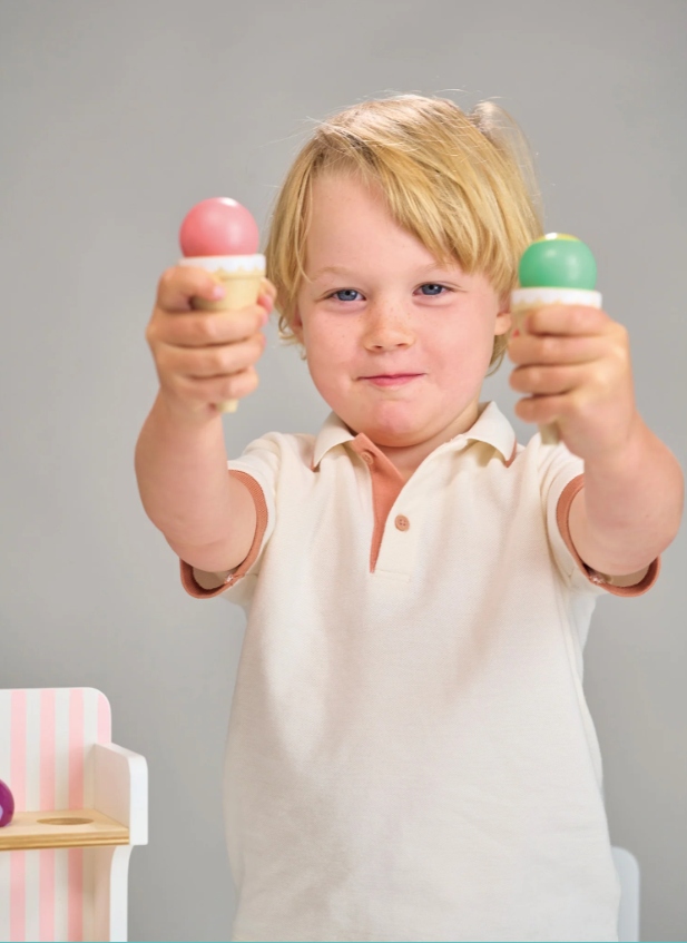 Transform playtime into a delightful ice cream adventure with this charming kiosk! Choose from three wooden cones and three colourful ice cream scoops to create your perfect pretend treat. Press the magical red button and watch as your scoop tumbles down onto the cone - pure magic every time! Ideal for sparking imaginative play, encouraging language development, and hours of creative fun. Perfect for little ones aged 3 and up who love role-play games and hands-on exploration.